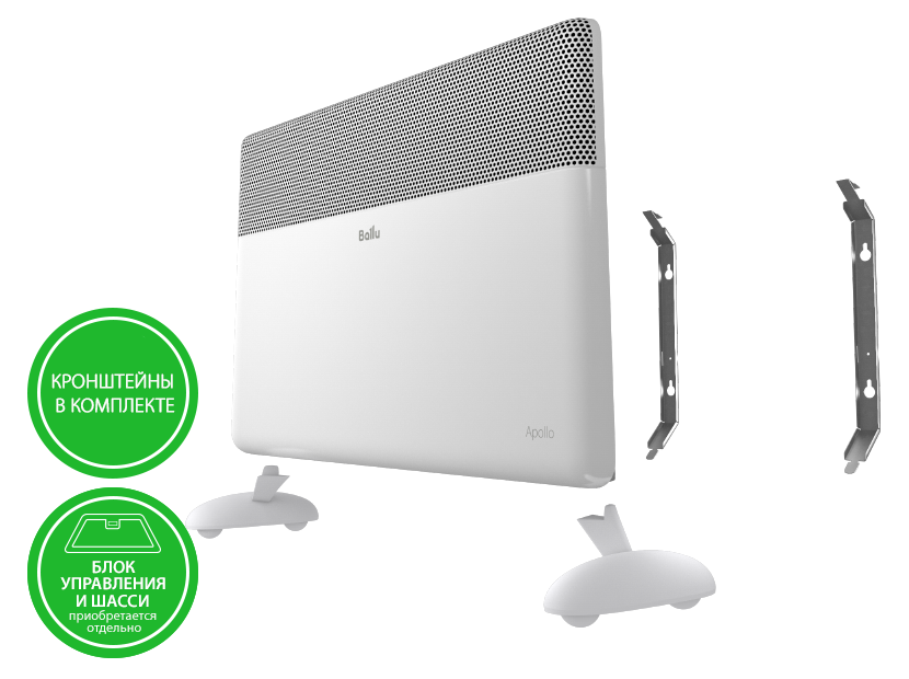 Для работы конвектора Apollo необходимо обязательно выбрать один из трех блоков управления и при необходимости напольной установки – шасси.